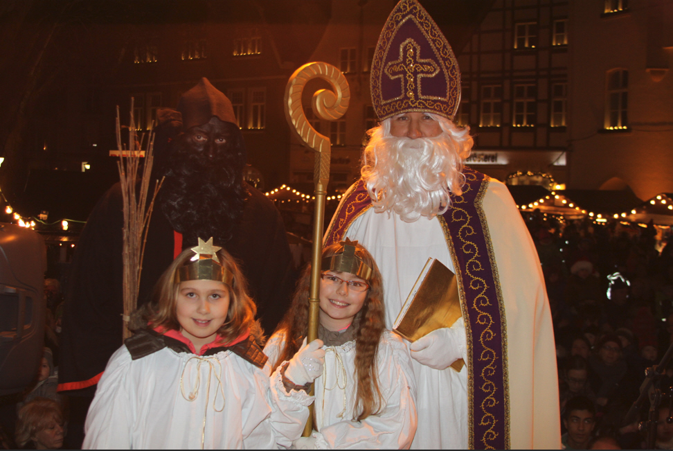 Liebe Heimat- und Geschichtsfreunde, seit 1946 organisiert der Heimat- & Geschichtsverein mit finanzieller Unterstützung der Stadt Beckum den Nikolausumzug mit Pferden und Kutsche durch die Beckumer Innenstadt. Am Freitag, den 5. Dezember 2025 ist es wieder soweit !! Ab 17.00 Uhr startet der Umzug mit Glockengeläut vom Hindenburgplatz aus. Der Nikolaus wird zusammen mit Knecht Ruprecht und zwei Engelchen (s. Foto) über Ostwall, Oststraße, Linnenstraße und Nordstraße zum Marktplatz in einer von Kaltblut-Hengsten gezogenen offenen Kutsche fahren und musikalisch vom seit 1927 bestehenden Spielmannszug Semper-Talis Beckum begleitet. Gegen 17.45 Uhr spricht der Nikolaus von der Tribüne des Weihnachtsmarktes zu den kleinen und großen Menschen und die Engelchen tragen ein adventliches Gedicht vor. Danach werden über 500 Plätzchen-Tüten vom „echten“ Nikolaus und seinen Helfern an die anwesenden Kinder kostenlos verteilt. Sie wurden durch eine großzügige Spende der EVB finanziert. Kommen Sie mit Ihren Kindern und/oder Enkeln zu diesem traditionellen Umzug – erleben Sie vorweihnachtliche Atmosphäre in der Beckumer Innenstadt ! Freundliche Grüße aus Holter, Ihr Stefan Wittenbrink PS: Werfen Sie gern einen aktuellen Blick auf unsere Internetseite www.heimatverein-beckum.de !! Foto: Wolfgang Krogmeier (Die Glocke) |