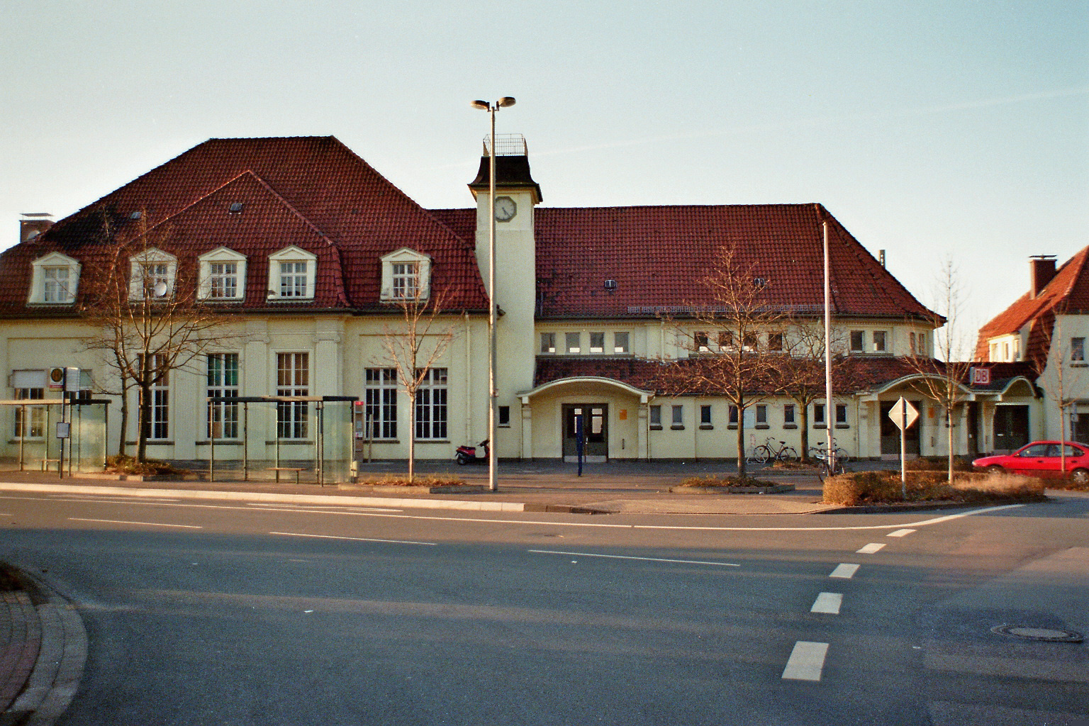 Empfangsgebäude an der Eisenbahnstrecke Köln-Minden . Errichtet um 1918 als langgestreckter verputzter Gebäudekomplex mit pfannengedeckten Dächern.