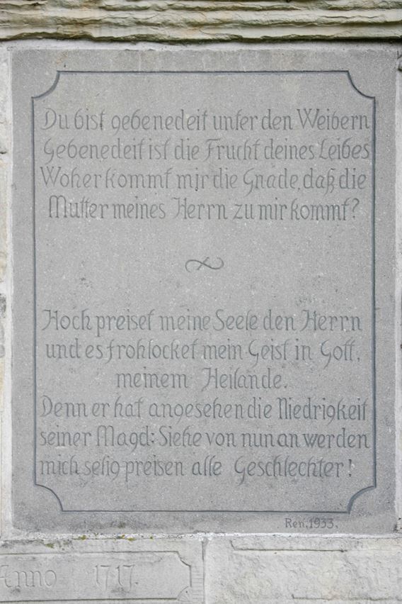 Auf hohem Sockel mit hochrechteckiger Inschriftplatte aus Gußstein (bez. 1933) eine Reliefplatte aus Sandstein in Form einer freistehenden Wappenkartusche, gedeckt von flachem Giebeldach aus Gußstein. Darstellung der Begegnung von Maria und Elisabeth, darüber die Taube des Heiligen Geistes. In den beiden oberen Ecken geflügelte Engelsköpfe. Unten am Sockel Jahreszahl 1717.