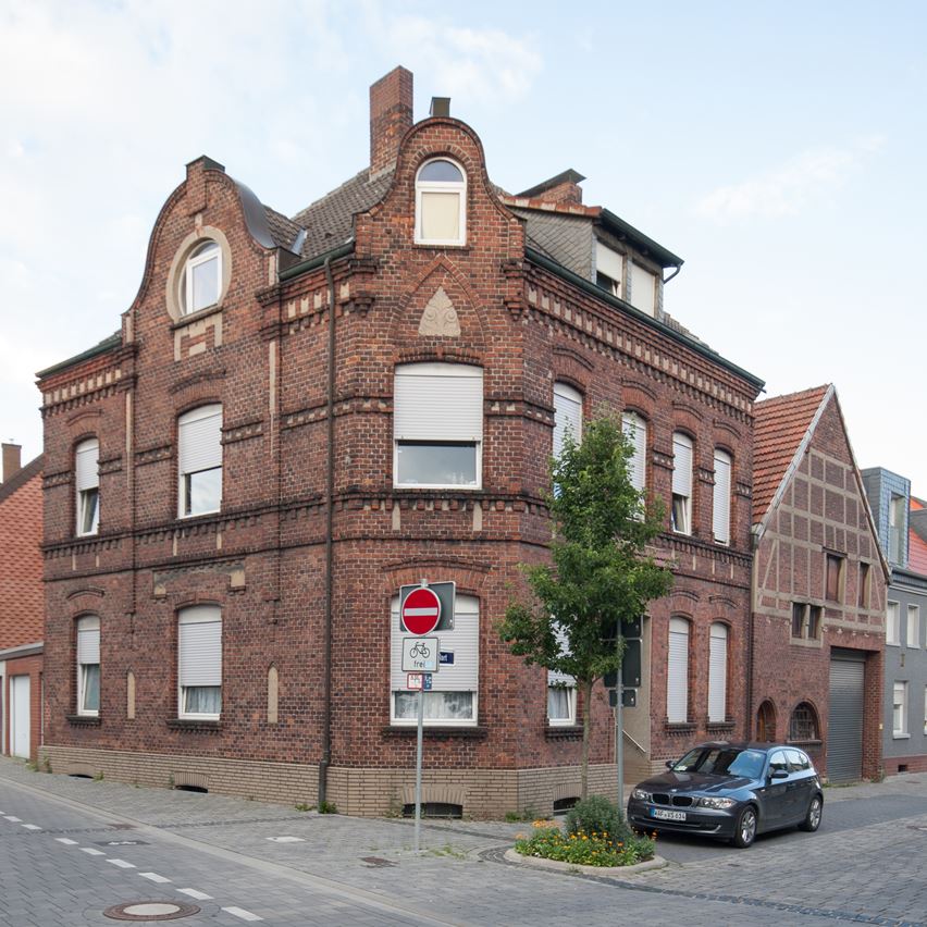 Zweigeschossiger traufenständiger Backsteinbau in Ecklage.