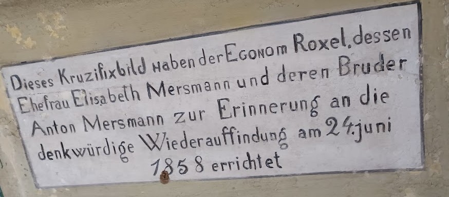 Die Kapelle erinnert an die Wiederauffindung des für die Wallfahrt nach Stromberg entscheidenden Kruzifix, das am 21.11.1845 gestohlen worden war. An der Stelle der Kapelle wurden die Bestandteile des Korpus am 02.09.1856 vergraben wieder aufgedeckt, ausgegraben und in einer feierlichen Prozession am 14.09.1856 in die Wallfahrtskirche Stromberg zurückgebracht. Die Auffindung des Kruzifixes geschah durch den Schäfer Anton Mersmann, das Gelände gehörte dem Bauern Roxel. Dieser ließ aus Dankbarkeit anschließend die Kapelle auf seinem Gelände errichten.