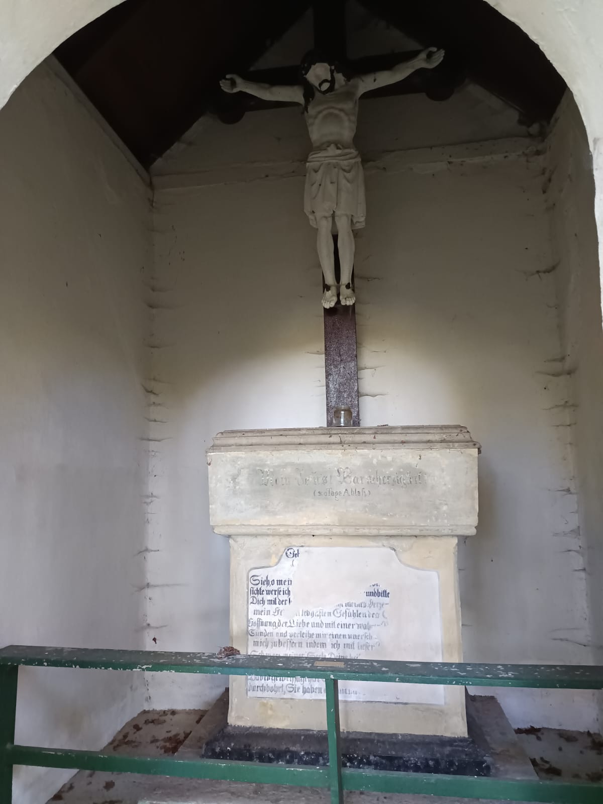 Im Inneren der Kapelle befindet sich ein massiver Altar mit großem aufstehendem Kruzifix.