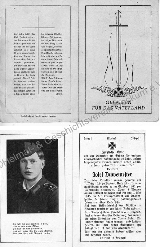 | Duventester, Franz. | Beckum | 27.11.1924 | Russland/Mius | 23.07.1943 |