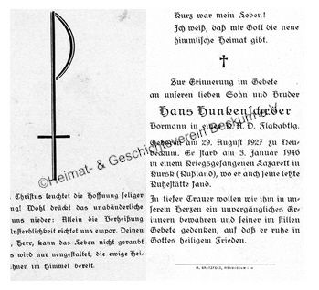 | Hunkenschröer, Hans | Neubeckum | 29.08.1927 | Russland - Kursk | 03.01.1946 |